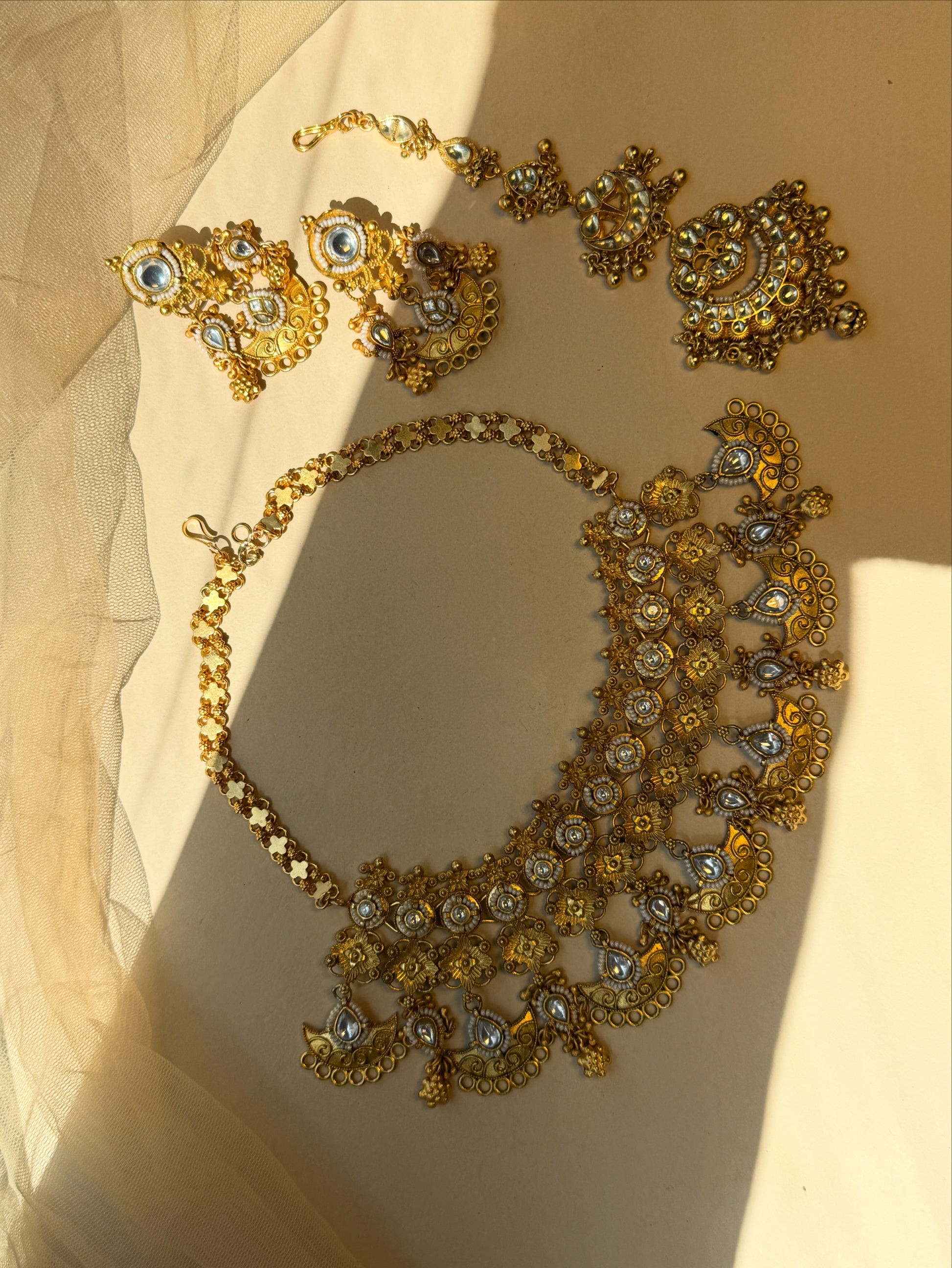 Indian beaded carving designed flat beaded style gold plating choker set with pretty half circle design at edges. The necklace has the linked charm style chain and strand in layer. Matching earrings and Maangtikka with a 3 motif layer design comes with this set.